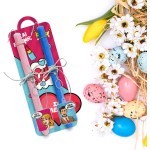 Η λαμπάδα έχει ύψος 30cm και είναι φτιαγμένη με προσεγμένες λεπτομέρειες, με έντονα χρώματα και γιορτινό σχεδιασμό που συνδυάζει την παραδοσιακή πασχαλινή αισθητική με μοντέρνα, παιχνιδιάρικα στοιχεία.