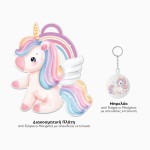 Με ύψος 30cm, αποτελεί ιδανικό δώρο για παιδιά, βαφτιστήρια ή μικρούς λάτρεις των μονόκερων, ενώ το μπρελόκ μπορεί να χρησιμοποιηθεί ξεχωριστά ως αναμνηστικό ή διακοσμητικό.