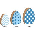 Κατασκευασμένο από ξύλο MDF με λεπτομερή ζωγραφισμένα γαλάζια σχέδια σε κάθε μέγεθος αυγού, ανθεκτικό και κομψό, ιδανικό για εσωτερική διακόσμηση και πασχαλινά δώρα.