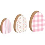 Κατασκευασμένα από ξύλο MDF με λεπτομερή ζωγραφισμένα ροζ και λευκά σχέδια για κάθε μέγεθος αυγού, ανθεκτικά και κομψά, ιδανικά για εσωτερική διακόσμηση και πασχαλινά δώρα.