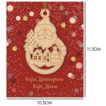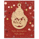 Η κάρτα είναι φτιαγμένη στο χέρι με ξύλινα διακοσμητικά στοιχεία, προσφέροντας μοναδικό χαρακτήρα και προσοχή στη λεπτομέρεια. Η επεξεργασία ολοκληρώνεται με θερμοτυπία, γκλίτερ και στρασάκια, δημιουργώντας μια πολυτελή και λαμπερή εμφάνιση κατάλληλη για τη γιορτινή ατμόσφαιρα των Χριστουγέννων.