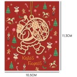 Η κάρτα είναι φτιαγμένη στο χέρι με ξύλινα διακοσμητικά στοιχεία, προσφέροντας μοναδικό χαρακτήρα και προσοχή στη λεπτομέρεια. Η επεξεργασία ολοκληρώνεται με θερμοτυπία, γκλίτερ και στρασάκια, δημιουργώντας μια πολυτελή και λαμπερή εμφάνιση κατάλληλη για τη γιορτινή ατμόσφαιρα των Χριστουγέννων.