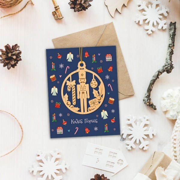 Η κάρτα είναι φτιαγμένη στο χέρι με ξύλινα διακοσμητικά στοιχεία, προσφέροντας μοναδικό χαρακτήρα και προσοχή στη λεπτομέρεια. Η επεξεργασία ολοκληρώνεται με θερμοτυπία, γκλίτερ και στρασάκια, δημιουργώντας μια πολυτελή και λαμπερή εμφάνιση κατάλληλη για τη γιορτινή ατμόσφαιρα των Χριστουγέννων.
