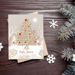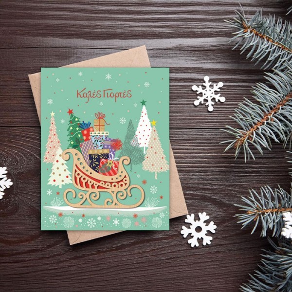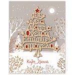 Η κάρτα είναι φτιαγμένη στο χέρι με ξύλινα διακοσμητικά στοιχεία, προσφέροντας μοναδικό χαρακτήρα και προσοχή στη λεπτομέρεια. Η επεξεργασία ολοκληρώνεται με θερμοτυπία, γκλίτερ και στρασάκια, δημιουργώντας μια πολυτελή και λαμπερή εμφάνιση κατάλληλη για τη γιορτινή ατμόσφαιρα των Χριστουγέννων.