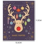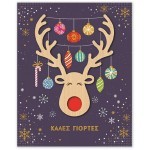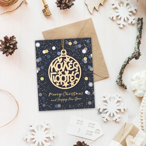 Η κάρτα είναι φτιαγμένη στο χέρι με ξύλινα διακοσμητικά στοιχεία, προσφέροντας μοναδικό χαρακτήρα και προσοχή στη λεπτομέρεια. Η επεξεργασία ολοκληρώνεται με θερμοτυπία, γκλίτερ και στρασάκια, δημιουργώντας μια πολυτελή και λαμπερή εμφάνιση κατάλληλη για τη γιορτινή ατμόσφαιρα των Χριστουγέννων.