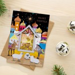 Κατασκευασμένη από ποιοτικό χαρτόνι με λαμπερά και διακοσμητικά στοιχεία, η κάρτα είναι ανθεκτική και όμορφη. Η επιφάνεια είναι ιδανική για να γράψεις τα δικά σου, θερμά μηνύματα ευχών.