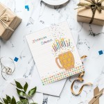 Η κάρτα είναι φτιαγμένη στο χέρι με ξύλινα διακοσμητικά στοιχεία που την κάνουν να ξεχωρίζει. Η επεξεργασία ολοκληρώνεται με θερμοτυπία, γκλίτερ και στρασάκια, δημιουργώντας μια λαμπερή και γιορτινή εμφάνιση που αποτυπώνει τη χαρά και το πνεύμα των γενεθλίων.