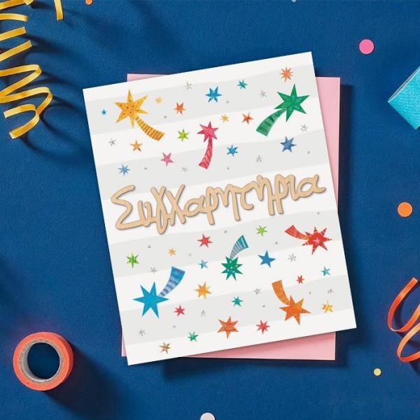 Η κάρτα είναι φτιαγμένη στο χέρι με ξύλινα διακοσμητικά στοιχεία που προσδίδουν μοναδικότητα και λεπτομέρεια στην εμφάνισή της. Η επεξεργασία ολοκληρώνεται με θερμοτυπία, γκλίτερ και στρασάκια, δημιουργώντας μια λαμπερή και χαρούμενη σύνθεση που αποτυπώνει τη γιορτινή διάθεση της βάπτισης.
